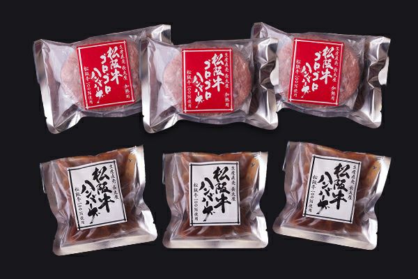 お肉本来の旨みを直営レストランのデミグラスソースでお楽しみいただける「松阪牛ハンバーグ」と、全て手作業で角切りにしたお肉をふんだんに使用したステーキのような食感の「松阪牛ゴロゴロハンバーグ」の詰め合わせです。